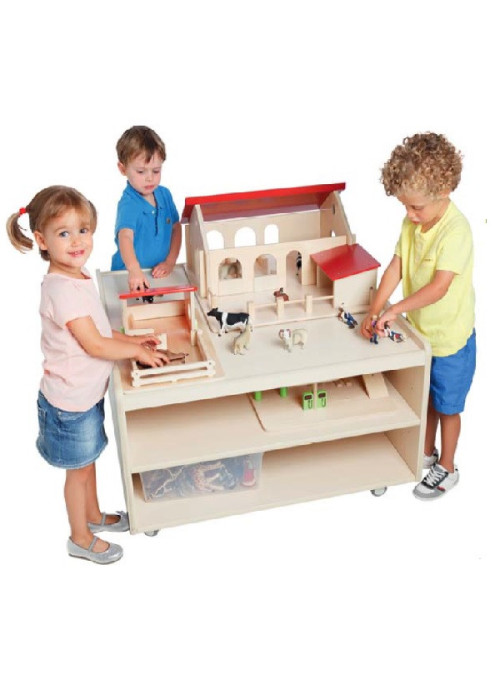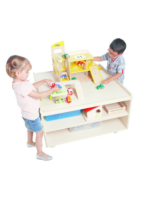 Questa struttura in legno può essere un grande tavolo da gioco, ideale per giocare mentre i bambini sono in piedi, ma può essere anche uno scaffale a giorno su 2 lati con ripiani regolabili e 4 ruote piroettanti autobloccanti. Con istruzioni di montaggio. Dimensioni: 86 x 86 x 49 cm .