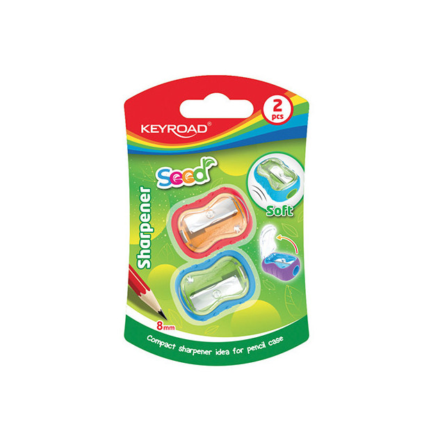 Temperamatite 1 foro per matite ø mm.8. Antiscivolo, coperchio di sicurezza trasparente. Rivestimento morbido ed ergonomico. In blister da 2 pezzi o in in barattolo formato scuola da 72 pz.