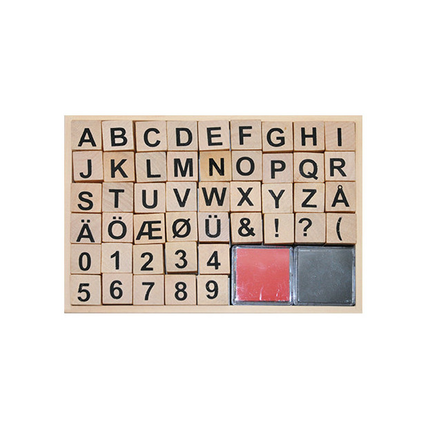 Set timbri in legno (46 pezzi) + 2 cuscinetti inchiostranti.