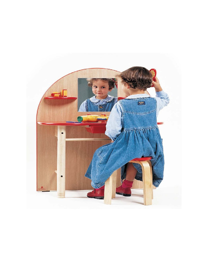 Mobile in laminato color faggio e rosso con 1 specchio, 2 mensole laterali e 1 piano con cassetto in plastica. Altezza ripiano cm 52. Dimensioni 75 x 33 x 90 cm. Sgabello non incluso.