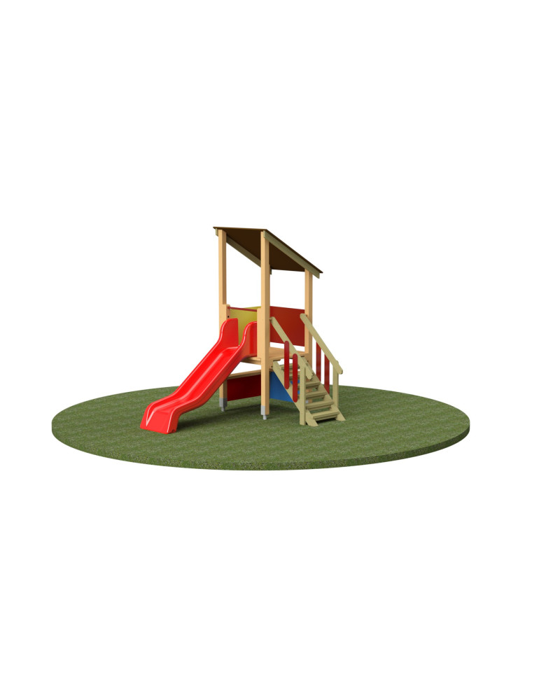 Torre con montanti e traversi in abete scandinavo bilama, tetto e pedana (cm 105 h da terra) in compensato di betulla ad incollaggio fenolico con finitura antiscivolo e rinforzo di sostegno in pino massello. Le doghe delle balaustre sono in abete scandinavo. I copridadi sono in polipropilene giallo e il tettuccio in HPL rosso. Gradini in pino massello, scivolo realizzato in polietilene rotazionale colorato. La componente lignea è impregnata a pressione RAL 3 con preservanti senza cromo e arsenico, e la componente metallica è in acciaio galvanizzato e materiali inossidabili. Questo prodotto viene spedito su pallet, e sono soggetti a contributo spese di spedizione. Dimensioni totali cm 385x310x98/306
