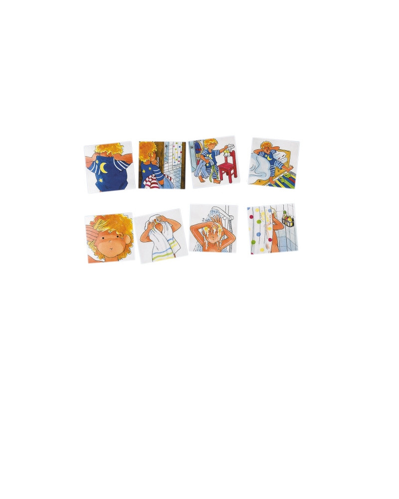 Una serie di 75 carte, illustrate con le azioni che riempiono l’intera giornata di ogni bambino. Permettono l’elaborazione cronologica delle attività, il racconto personale dei fatti, l’uso dei diversi tempi dei verbi, il confronto di abitudini e culture. Un materiale che ha un’infinità di applicazioni nelle scuole dell’infanzia e oltre. Contenuto: 75 carte 9 x 9 cm. Da 3+ anni.