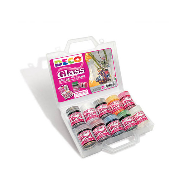 I colori per vetro DECO sono colori trasparenti ideali per dipingere a freddo su vetro, metallo lastre in plexi e altro. La valigetta è composta da 10 flaconi 35 ml. colori assortiti.