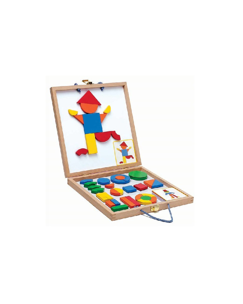 Lavagna magnetica in cassetta di legno con 42 pezzi magnetici e 24 cartemodello. Dimensioni carte 8,5 x 8,5 cm. Dimensione valigetta: 28,6 x 28,6 x 3,8 cm.