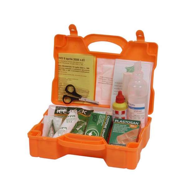 Valigetta Pronto Soccorso Norma CE: I prodotti definiti dispositivi medici, contenuti nel kit Pronto Soccorso sono conformi alla direttiva CE 93/42 e al DL 24.2.97. Contenitore: valigetta realizzata in polipropilne antiurto, colore arancio (mm.250 x 190 x 90 h, peso Kg.1,40) Contenuto: 1 Copia Decreto Min 388 del 15.07.03 2 Paia di guanti sterili 1 Flacone disinfettante 500 ml. IODOPOVIDONE al 10% Iodio PMC 1 Flacone soluzione fisiologica sterile 250 ml. CE 1 Busta garza sterile cm.18 x 40 3 Buste garza sterile cm.10 x 10 1 Pinza sterile 1 Confezione di cotone idrofilo 1 PLASTOSAN 10 cerotti assortiti 1 Rocchetto cerotto adesivo m.5 x 2,5 cm. 1 Benda di garza da m. 3,5 x 10 cm. 1 Paio di forbici tagliabendaggi cm.14,5 DIN 58279 1 Laccio emostatico 1 ICE PACK ghiaccio istantaneo 1 Sacchetto per rifiuti sanitari mm.250 x 350 1 Istruzioni MULTILINGUA Pronto Soccorso