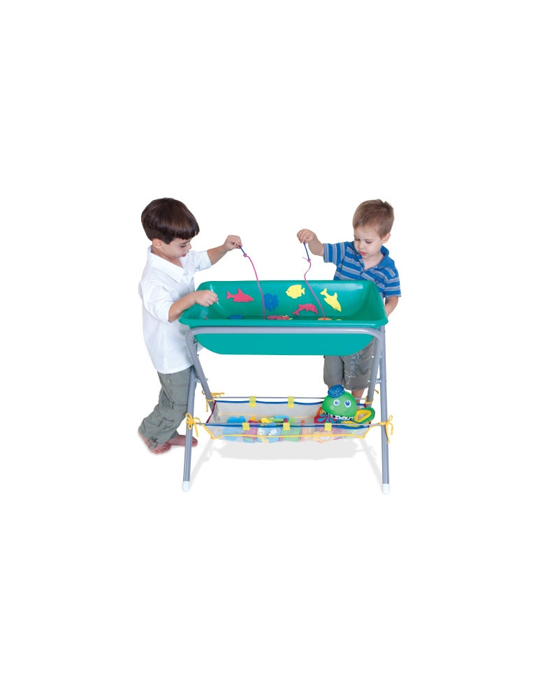 Telaio pieghevole in acciaio robusto con ripiano in nylon e due rotelle per consentire un facile spostamento. Dimensioni: vasca cm 70x50x15h | telaio cm 58h