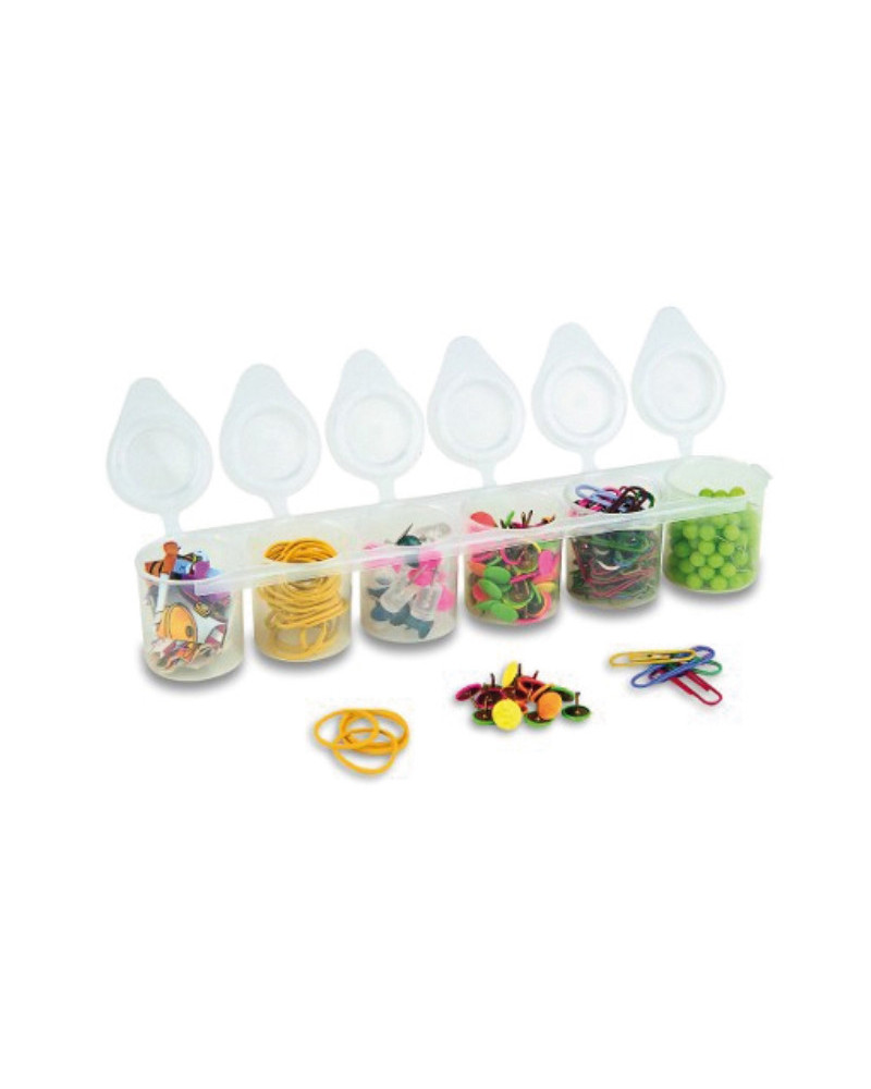 Serie di 6 vasetti da 25 ml in materiale plastico. Dotati di coperchio imperdibile, adatte a raccogliere, suddividere e conservare materiali vari o a miscelare colori e conservare le miscele ottenute.