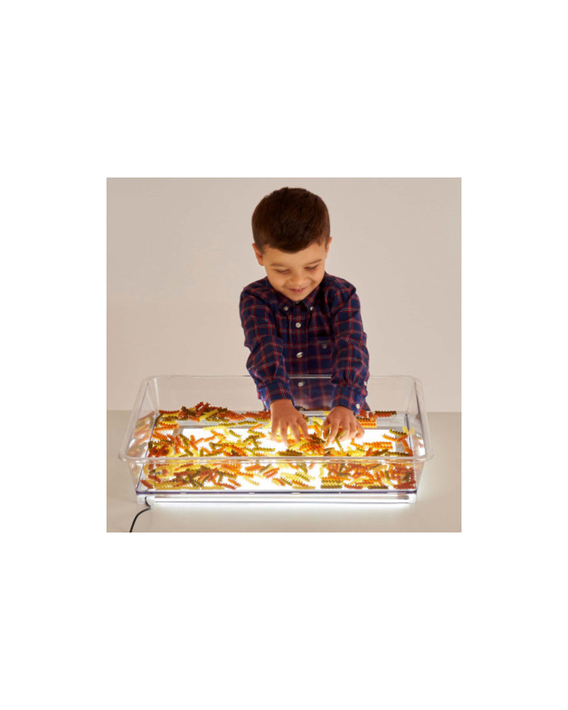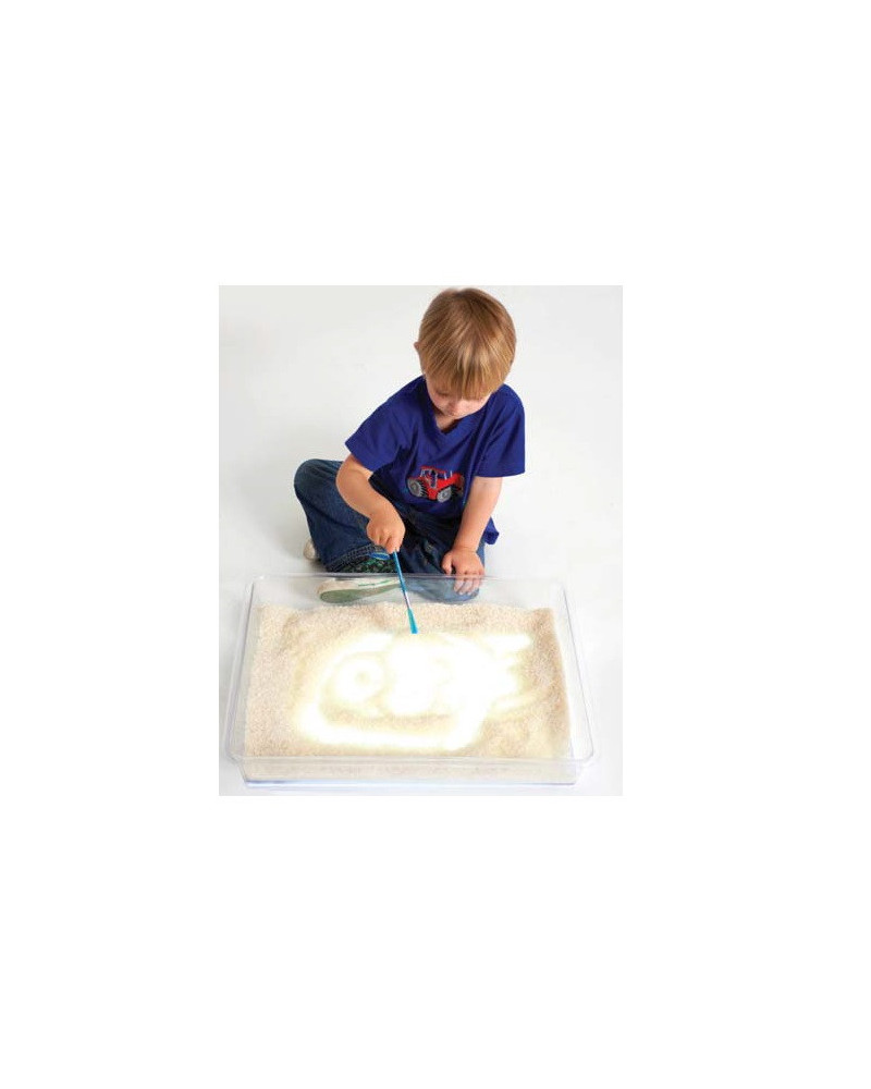 Vassoio dalle grandi dimensioni realizzato in policarbonato trasparente che gli conferisce incredibile robustezza e durevolezza nel tempo: la sua rigidità fa sì che, anche quando riempito di acqua, può essere sollevato e spostato senza che si fletta! Il vassoio è stato progettato per adattarsi al piano rettangolare luminoso (codice G62035) in modo da illuminare le attività svolte al suo interno. Dimensioni: 56,5 x 44 x 10 cm. Adatto per l'uso con bambini sotto la supervisione di un adulto.