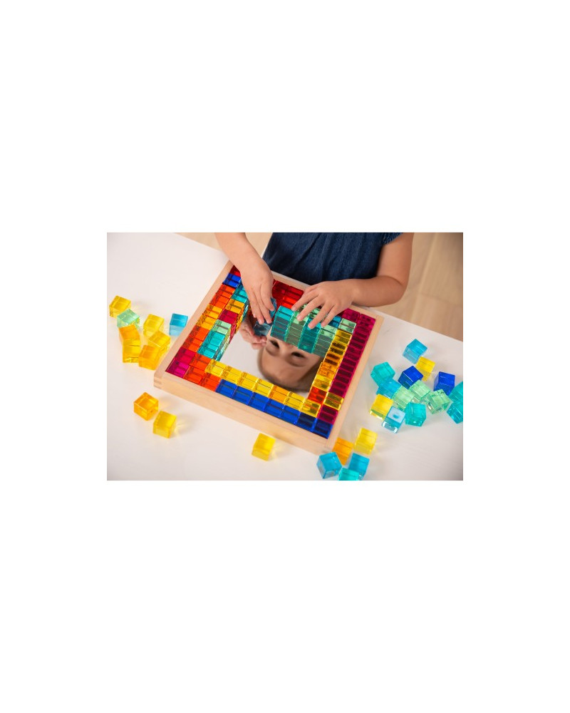 Splendido set composto da 100 gemme cilindriche in acrilico massiccio, disponibili in 10 colori e presentate in un vassoio in legno di faggio con base specchiata. Le gemme, lisce e luminose, riflettono la luce creando un effetto visivo affascinante, ideale per stimolare il gioco creativo e sensoriale. Perfetto per attività di ordinamento, creazione di schemi, conteggio, miscelazione dei colori e giochi di luce. Adatto sia ai più piccoli per attività manipolative e di costruzione, sia ai bambini più grandi per esercizi di sequenza, relazioni numeriche e sviluppo del linguaggio descrittivo. Facile da pulire con un panno umido e detergente delicato (evitare prodotti a base di ammonio). Dimensioni vassoio: 27,2 x 27,2 x 3 cm. Dimensioni gemme: 2,5 cm.