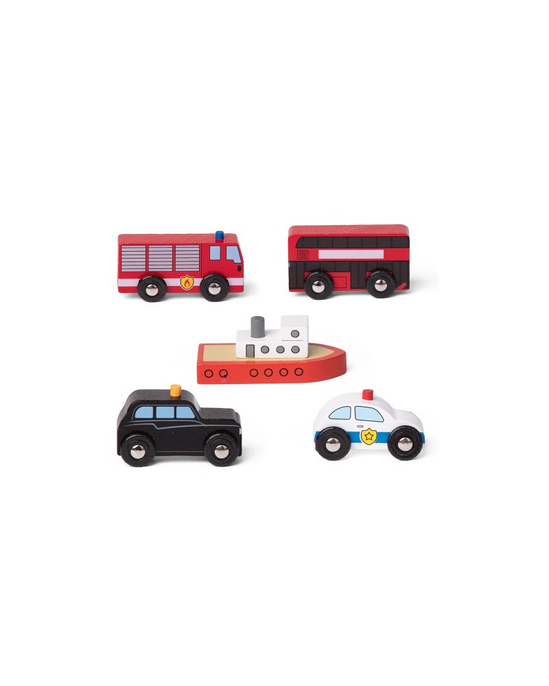 Il set di 5 pezzi comprende: un taxi nero, un autobus rosso a due piani, un'autopompa dei pompieri, un'auto della polizia e una barca. Infinite ore di divertimento creativo e di gioco di ruolo. Dimensioni da 6 a 11 cm. Da 3+ anni.