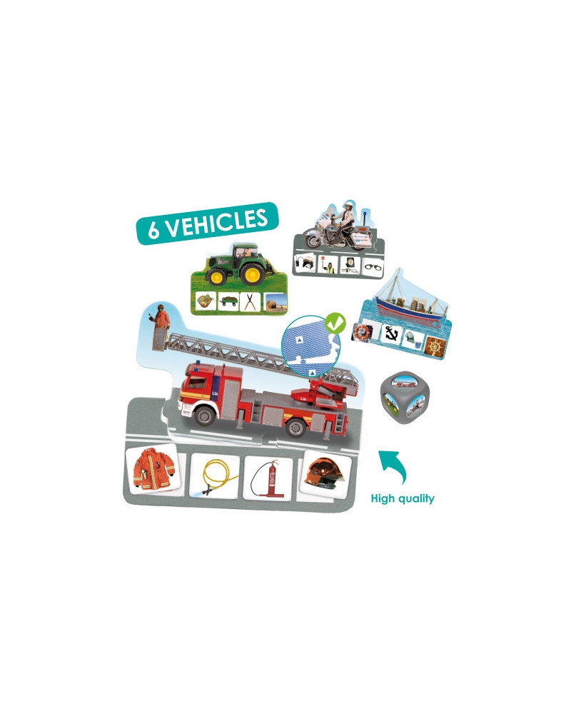 I bambini dovranno identificare e associare a ciascun veicolo di diverse professioni i propri mezzi del mestiere. Gioco di associazione con sistema di autocorrezione. Possono giocare fino a 6 giocatori. 6 schede-veicolo, 6 schede ambiente, 24 carte oggetti e 1 dado. Da 3+ anni.