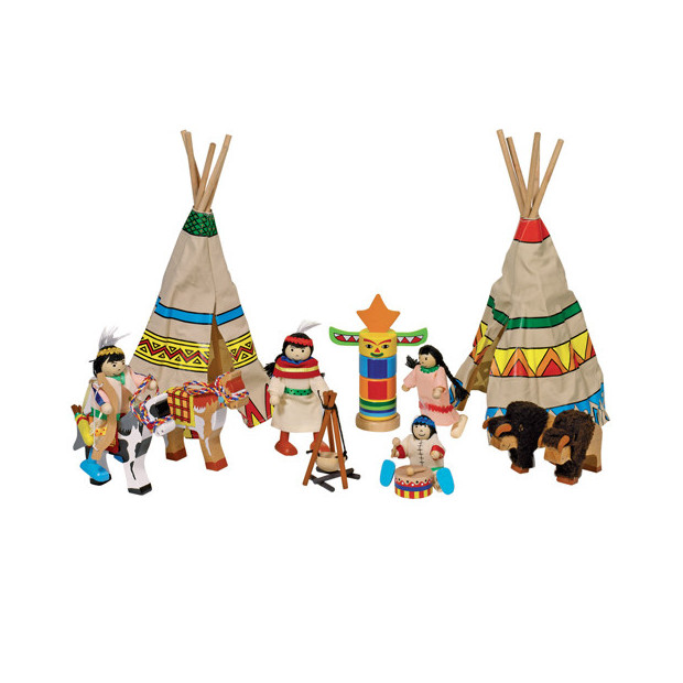 Le storie migliori si raccontano davanti al fuoco, dove il tamburo imita il suono della mandria di bufali. Le bambole snodabili e i loro accessori lasciano molto spazio all'immaginazione e al gioco libero! Per i piccoli pellerossa il set contiene: 2 capanne, 1 totem, falò, pentola, 2 bufali, 2 cavalli, 1 tamburo, 4 indiani. Adesso non manca niente per far rivivere il selvaggio West. Dimensioni capanna cm. 28. Dimensione personaggi cm. 9/11. Totale 14 pezzi