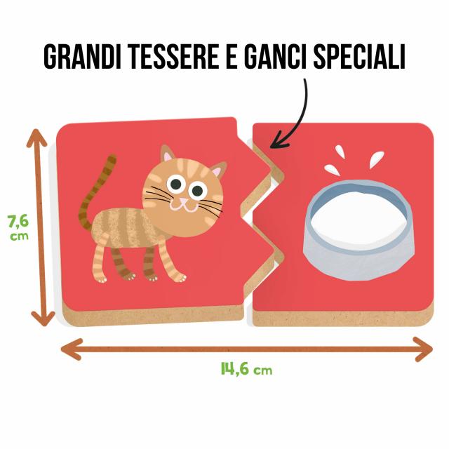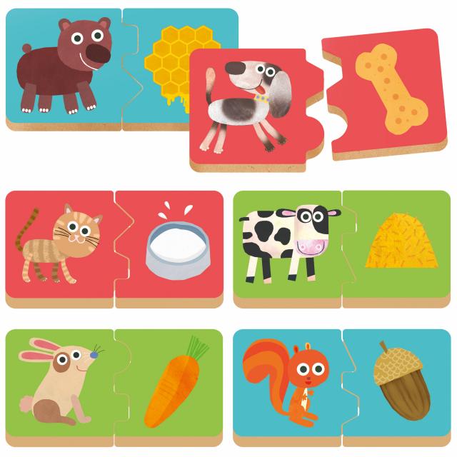 Di cosa è ghiotto il gatto? E il cagnolino cosa mangia? Divertiti ad associare i cuccioli al loro cibo preferito! Realizzato in robusto legno e con speciali ganci didattici, questo gioco stimola la logica e la manualità fine dei più piccoli.